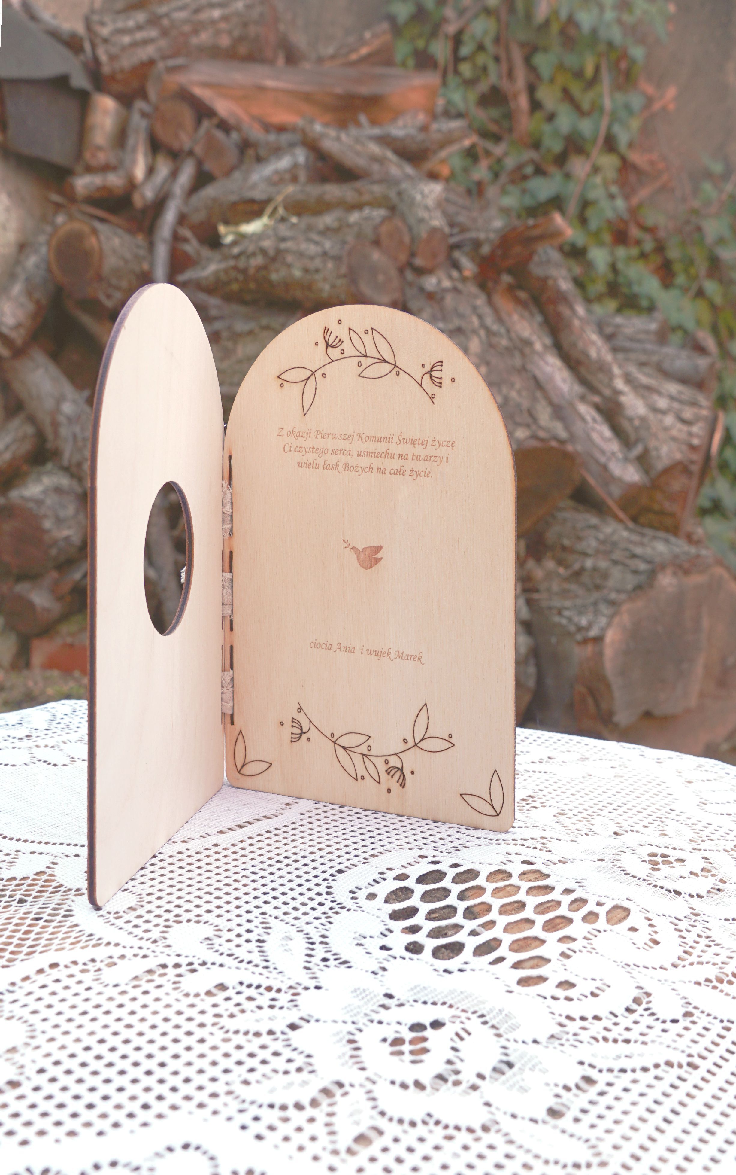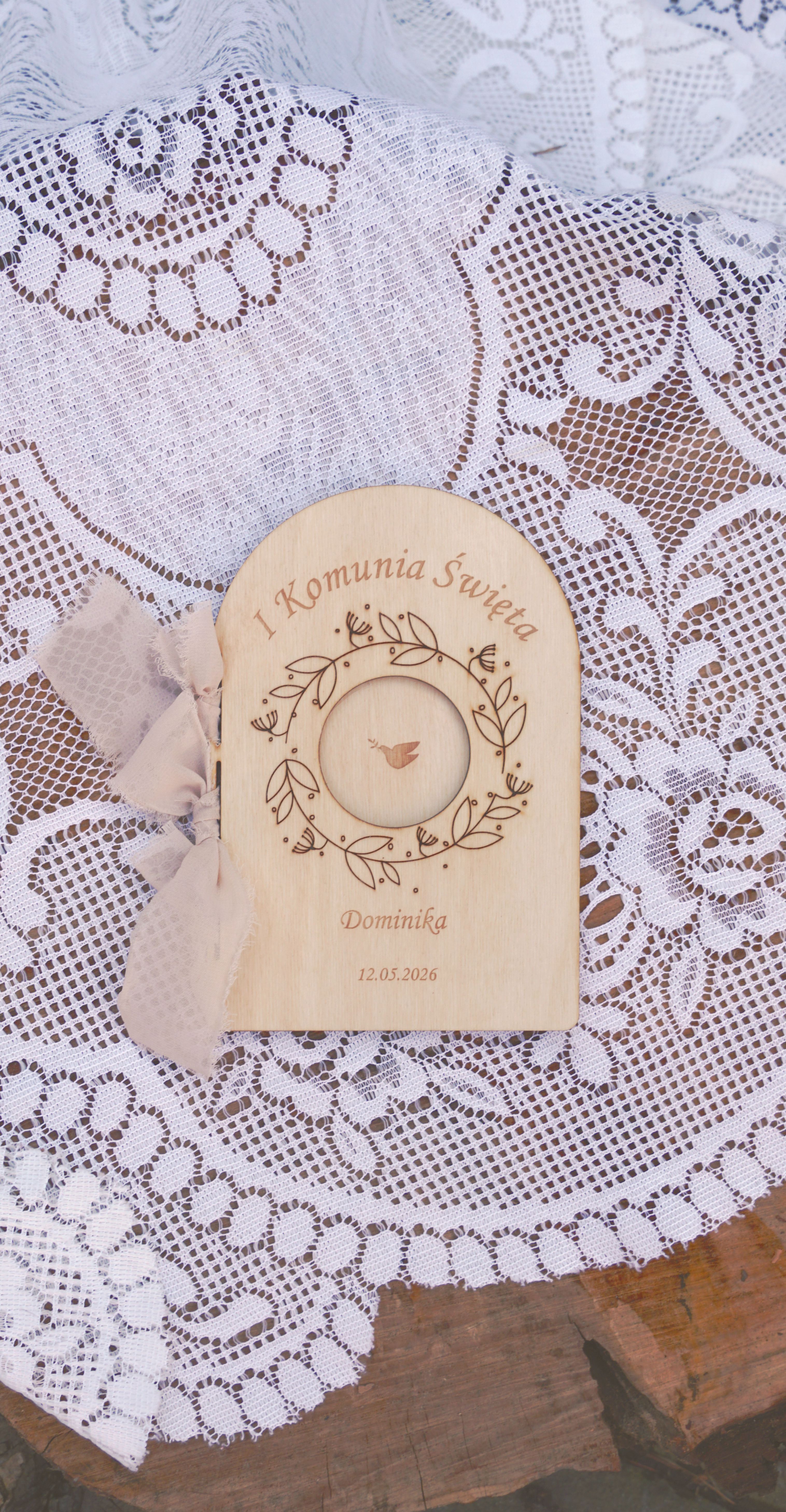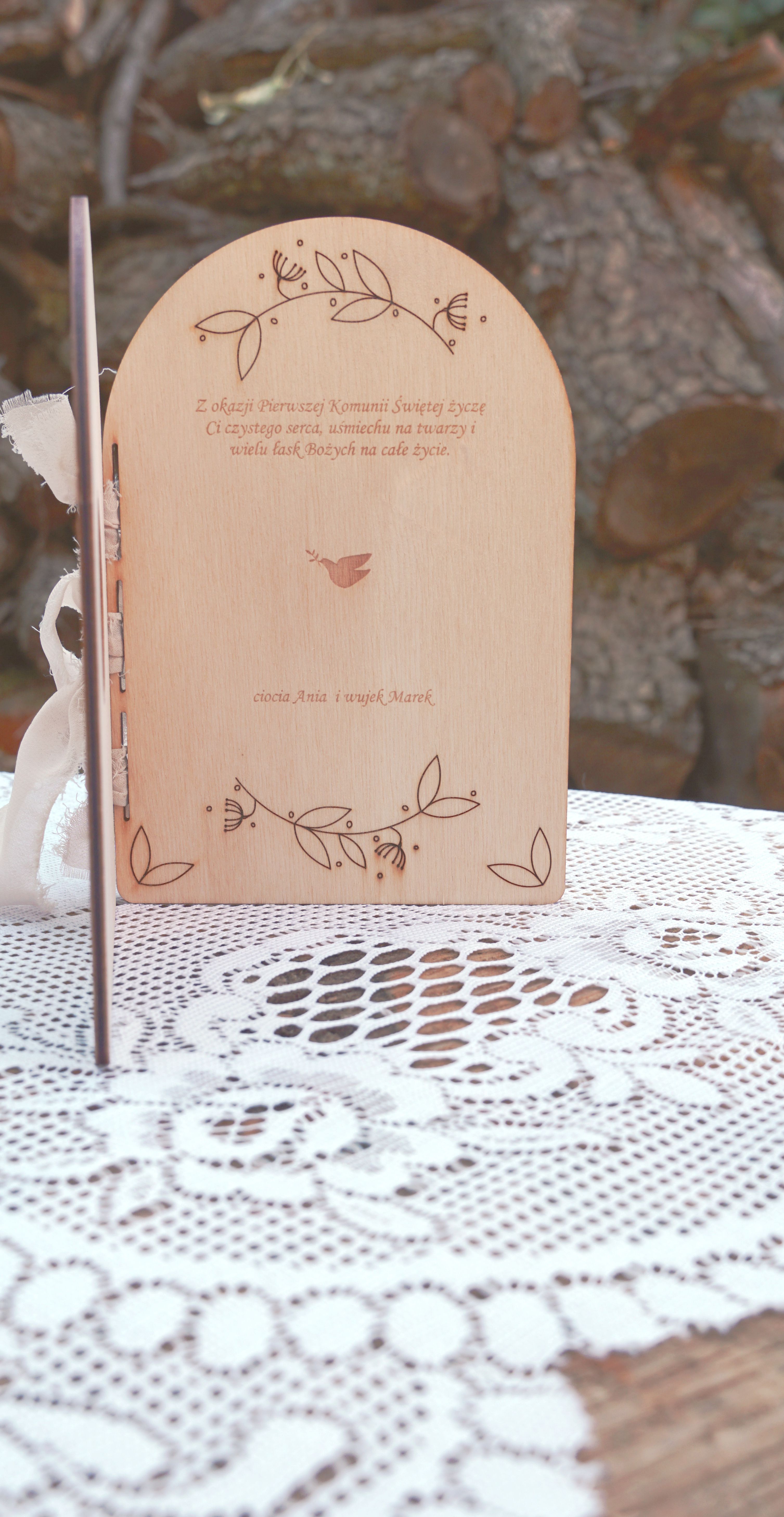 Elegancka drewniana kartka okolicznościowa z okazji Pierwszej Komunii Świętej to wyjątkowa pamiątka na lata. Kartka jest starannie wykonana i wiązana delikatnymi, szyfonowymi wstążkami, które dodają jej subtelności i uroku.