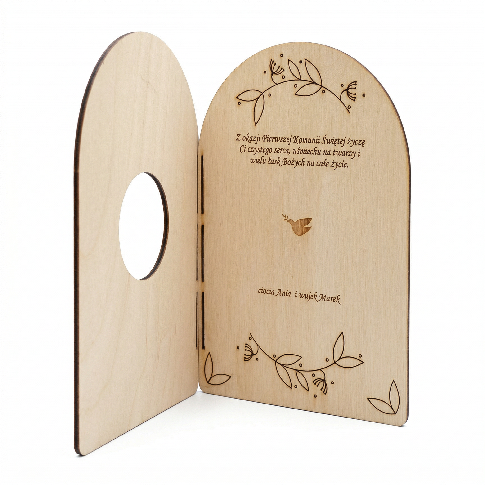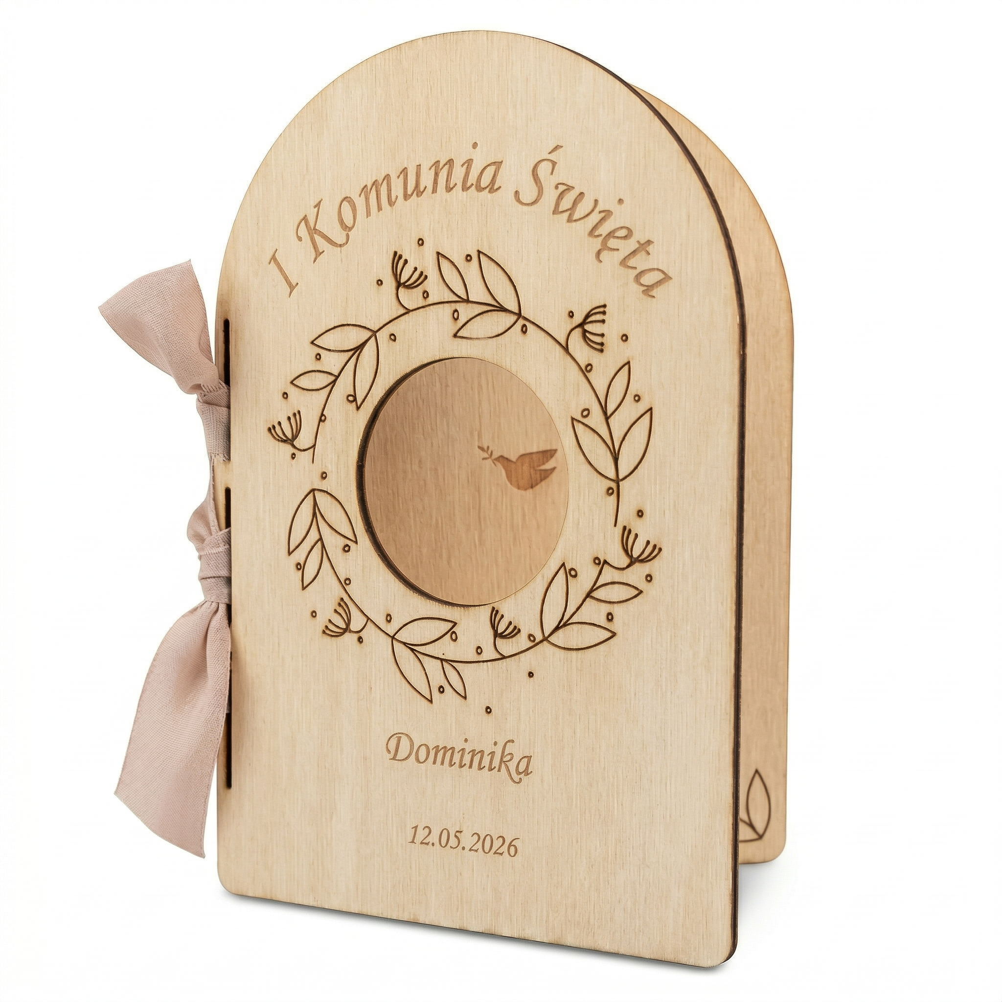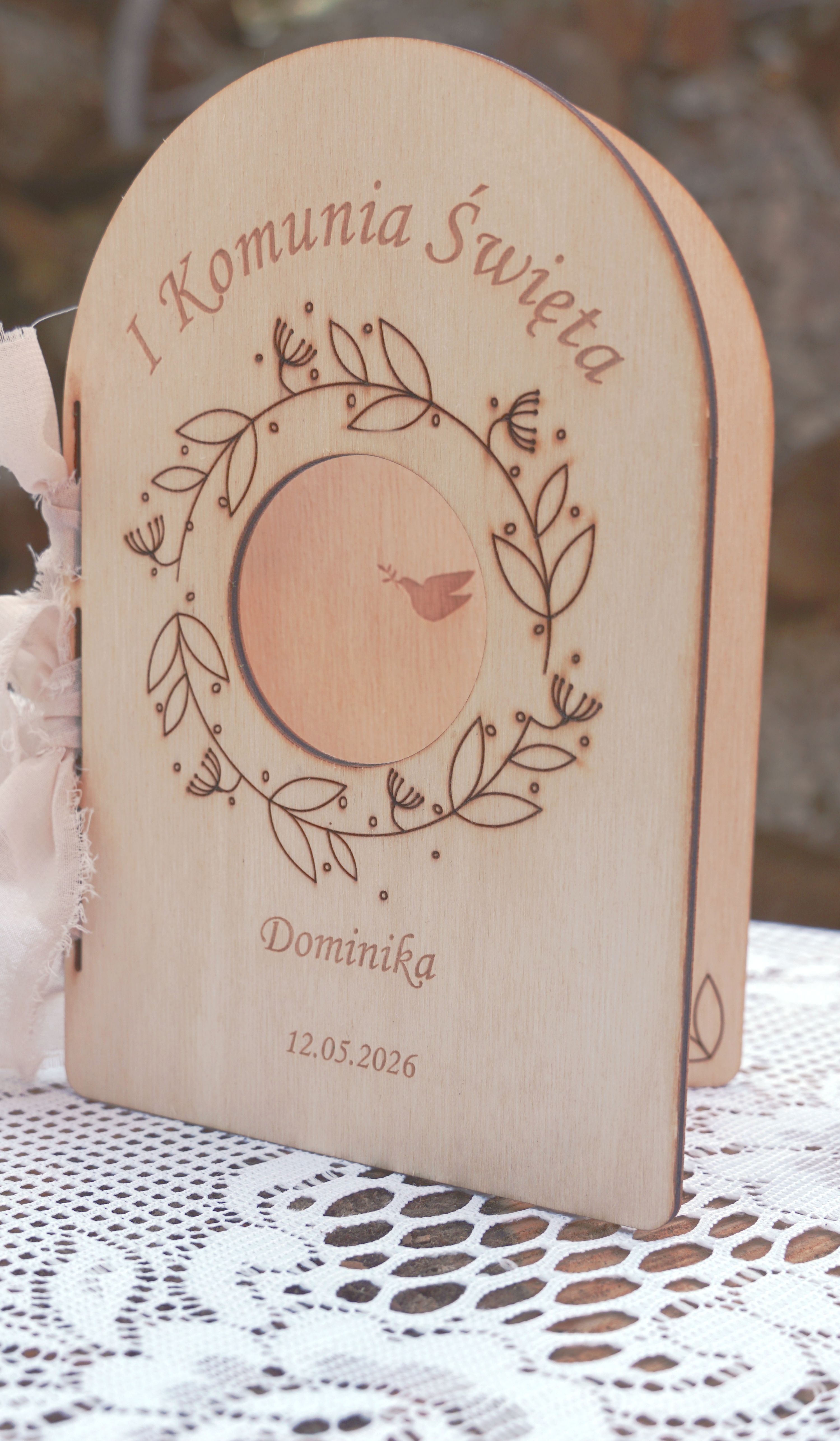 Elegancka drewniana kartka okolicznościowa z okazji Pierwszej Komunii Świętej to wyjątkowa pamiątka na lata. Kartka jest starannie wykonana i wiązana delikatnymi, szyfonowymi wstążkami, które dodają jej subtelności i uroku.